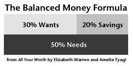 Para ser um pouco mais específica, apresento a seguir a fórmula do equilíbrio financeiro de Elizabeth Warren, que recomenda destinar 20% da renda líquida de impostos para poupança (“Savings”), manter as necessidades (“Needs”) abaixo de 50% e utilizar o que sobra para os desejos (Wants):